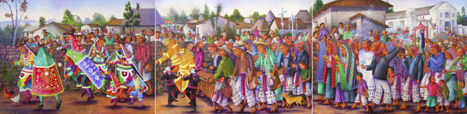 The left panel of the triptych shows dancers dressed as deer heading the procession. Pedro Rafaél, realizing the visual