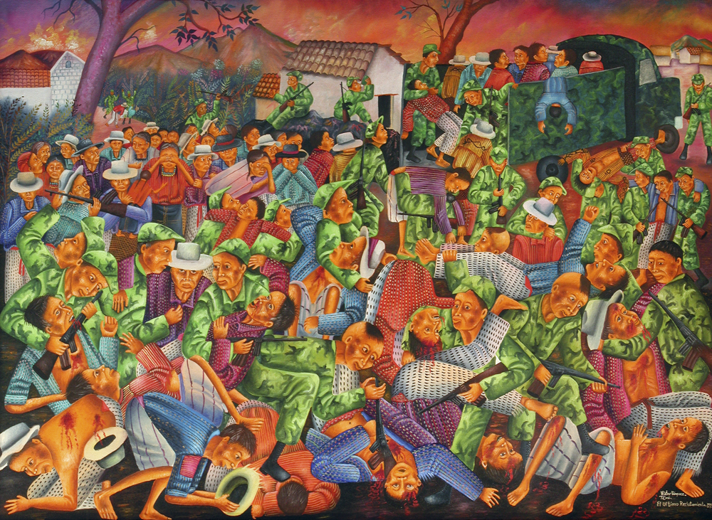 villages grapping young men off the street and forcing the to join the Guatemalan Army. Painting by Victor Vasquez Temó. Collection fo the