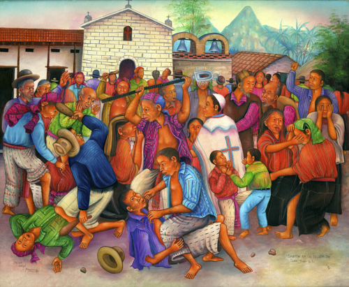 "División en la Iglesia de San Juan la Laguna," division in the church of San Juan la Laguna. Catholic priest John Vesey,