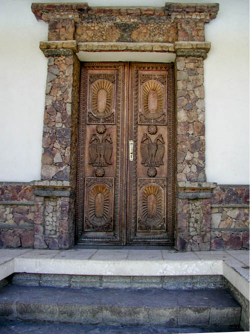 The elaborately carved front door to Juan Sisay's house with two-headed winged birds.